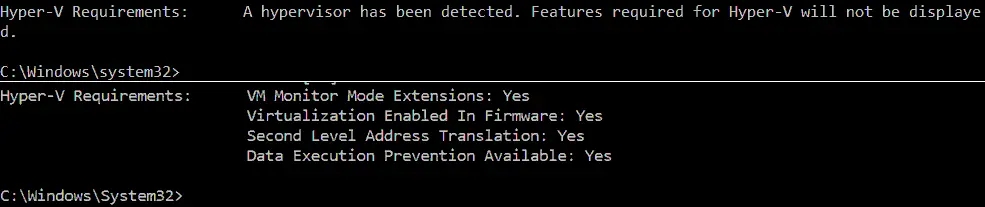 systeminfoto check whether Hyper-V is installed.If Hyper-V is not installed, in the Hyper-V requirements section, you see the names of the technologies required to install Hyper-V and the status of their availability on the machine.