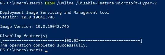 Run the following command to remove the Hyper-V feature from Windows 10: