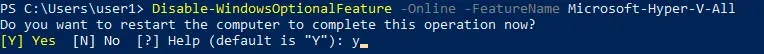 Hyper-V Windows 10 uninstallation in PowerShell Do you want to restart the computer to complete this operation now?